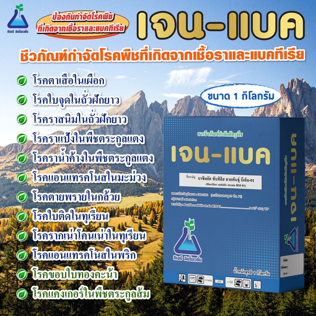 บาซิลลัส ซับทิลิส สายพันธุ์ บีเอ็ม-01 Bacillus subtilis 1 x109 strain BM-01 เจน-แบค เป็นชีวภัณฑ์ที่ใช้ในการป้องกันโรคพืชที่เกิดจากเชื้อราและเชื้อแบคทีเรีย ที่คัดเลือกมาจากธรรมชาติ ไม่มีการตัดต่อทางพันธุ์กรรม เจน-แบค มีกลไกการทำงานแบบแข่งขันในการใช้อาหาร, เป็นปรสิต, การสร้างสารปฏิชีวนะกับเชื้อสาเหตุโรคพืช สามารถใช้ได้กับพืชทุกชนิด เจน-แบค ใช้ในการป้องกันและควบคุมโรคพืชที่เกิดจากเชื้อรา เช่นโรคโคนเน่า โรคใบติดในทุเรียน เกิดจากเชื้อ Rhizoctonia solani โรครากเน่าโคนเน่าที่เกิดจากเชื้อรา Sclerotium rolfsii, Phytophthora spp. โรคเหี่ยวเหลือง และโรคตายพราย ที่เกิดจากเชื้อรา Fusarium spp., โรคใบจุดที่เกิดจากเชื้อรา Alternaria sp. และ Cercospora sp., โรคแอนแทรคโนส ที่เกิดจากเชื้อรา Colletotrichum spp. และโรคที่เกิดจากเชื้อแบคทีเรีย Xanthomonas sp. เช่นโรคแคงเกอร์ในพืชตระกูลส้ม และโรคขอบใบทองในคะน้า วิการใช้ • อัตรา 100 กรัมต่อน้ำ 20 ลิตร สามารถใช้ป้องกันตั้งแต่ก่อนปลูกพืช รองก้นหลุม ฉีดพ่นลงดิน ราดหรือปล่อยไปกับระบบน้ำ และฉีดพ่นลำต้นพืช ทุก 5-7 วัน • สามารถผสมสารกำจัดแมลง ปุ๋ย ฮอร์โมน และธาตุอาหารเสริม • ไม่แนะนำให้ใช้ร่วมกับสารป้องกันกำจัดเชื้อแบคทีเรีย ๆ สารเคมีกลุ่ม ไตรอะโซล , ทองแดง, กำมะถัน และชีวภัณฑ์กำจัดศัตรูพืชชนิดอื่น ๆ • ควรฉีดพ่นช่วงเวลาเย็น อากาศไม่ร้อน ฉีดพ่นทั่วทั้งต้นพืช หมายเหตุ เจน-แบค สามารถขยายเป็นเชื้อสดได้ อัตรา 100 กรัมผสมน้ำต้มสุกหรือน้ำสะอาด 1 ลิตร ทิ้งไว้ 24 ชั่วโมง (เขย่าหรือให้อากาศ) ผสมน้ำฉีดพ่นได้ 50-100 ลิตร ควรฉีดพ่น เจน-แบค ในเวลาตอนเย็นในสภาพแปลงที่มีความชื้น 60-70 เปอร์เซ็นต์
